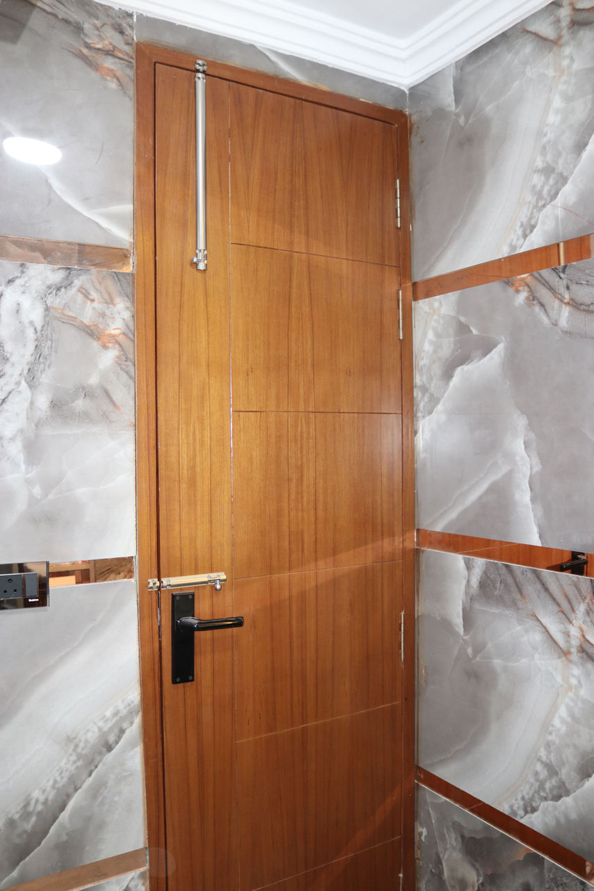 A wooden bathroom door combines natural warmth and aesthetic appeal with the practicality of moisture-resistant finishes, providing privacy while enhancing the overall decor of the bathroom.